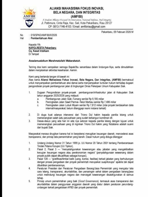 SIAK,(CYBER24.CO.ID) – Aliansi Mahasiswa Fokus Inovasi, Bela Negara, dan Integritas (AMFIBI) berencana menggelar aksi unjuk rasa terkait dugaan pengondisian tender proyek pembangunan jalan di Kabupaten Siak. Dalam surat pemberitahuan aksi yang beredar, AMFIBI menuding Triono Dul Hakim, suami Bupati Siak, diduga mengatur pemenangan sejumlah proyek infrastruktur di lingkungan Dinas Pekerjaan Umum Kabupaten Siak.
