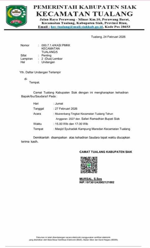 Surat undangan bernomor 000.7.1.4/KASI PMKK Kecamatan Tualang tertanggal 24 Februari 2026 yang ditandatangani Camat Tualang, Mursal, menyebut kegiatan tersebut bersifat penting. Namun dalam praktiknya, undangan kepada anggota DPRD dari daerah pemilihan Tualang disebut hanya ditujukan kepada yang beragama Islam, menyesuaikan dengan rangkaian Safari Ramadan yang digelar di masjid.