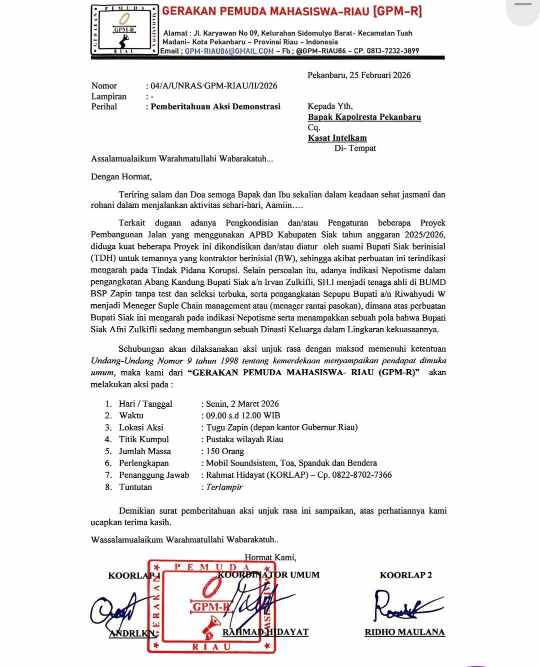 SIAK,(CYBER24.CO.ID)- Pemerintahan Kabupaten Siak kembali diguncang isu serius. Gerakan Pemuda Mahasiswa Riau (GPM-R) secara resmi melayangkan surat pemberitahuan aksi unjuk rasa yang akan digelar pada Senin, 2 Maret 2026, di Tugu Zapin, depan Kantor Gubernur Riau. Aksi tersebut ditujukan untuk mendesak pengusutan dugaan pengaturan proyek miliaran rupiah dan praktik nepotisme yang menyeret nama Bupati Siak, Afni Z. Jum’at, 27/2/2026.
