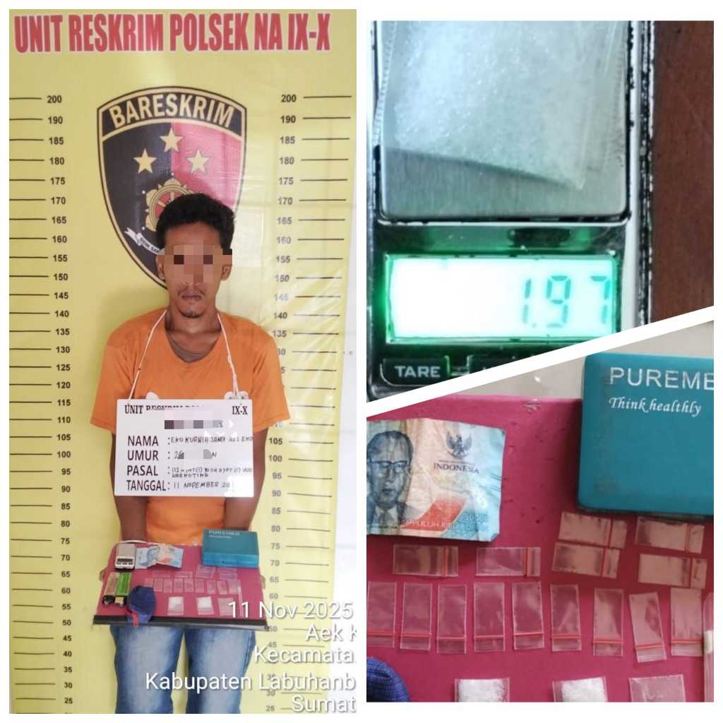 Labuhanbatu,(CYBER24.CO.ID) – Kembali Personel Unit Reskrim Polsek Na IX-X Polres Labuhanbatu berhasil ungkap kasus penyalahgunaan narkotika jenis sabu di wilayah hukumnya.ungkap kasus ini Selasa, 11 November 2025 di Dusun IIB Desa Kampung Pajak Kecamatan Na IX-X, Labura, Pelaku yang diamankan inisial EK (26), wiraswasta warga setempat.Rabu (12/11/2025).