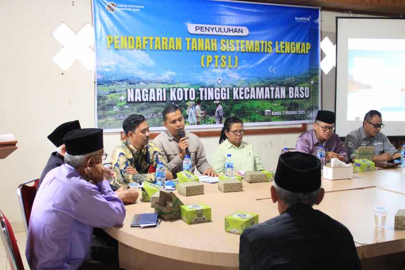 Baso,(CYBER24.CO.ID) – Kantor Pertanahan Kabupaten Agam melaksanakan kegiatan penyuluhan Pendaftaran Tanah Sistematis Lengkap (PTSL) di Aula Nagari Koto Tinggi, Kecamatan Baso, Kabupaten Agam pada Kamis (2/10) Kegiatan ini menghadirkan Ketua Ajudikasi, Rahmatsyah, S.Kom., M.M., sebagai narasumber utama.