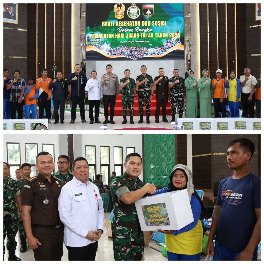 Pekanbaru,(CYBER24.CO.ID) – Kodam XIX/Tuanku Tambusai menyelenggarakan Bakti Kesehatan dan Sosial dalam rangka memperingati Hari Juang TNI AD Tahun 2025, Rabu (10/12/2025), bertempat di Aula Kaharudin Nasution Makodam XIX/Tuanku Tambusai, Jalan Mayor Ali Rasid, Kota Pekanbaru. Kegiatan ini mengusung tema “TNI AD Manunggal dengan Rakyat untuk Indonesia Bersatu, Berdaulat, Sejahtera dan Maju.”