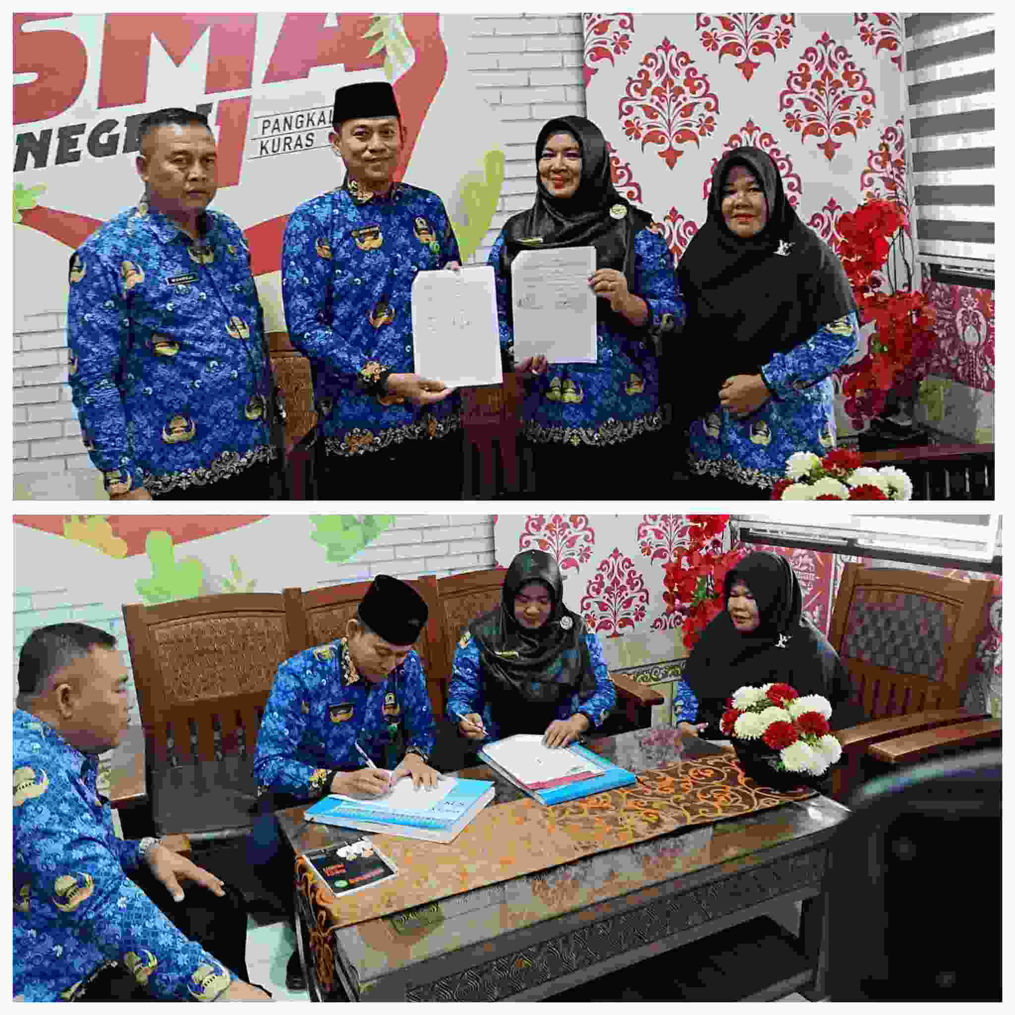 Penandatanganan dilakukan secara langsung oleh Kepala Sekolah SMAN 1 Pangkalan Kuras, Dewi Fitri, S.E., M.M., dan Penyuluh Agama Islam KUA Pangkalan Kuras, Irwan Syah, S.H.I. Acara ini juga disaksikan oleh jajaran penting sekolah, termasuk Humas, Muhroji, S.Pd, dan Waka Kesiswaan, Ganggo Rahanum, S.Ag.