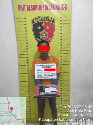 LABUHANBATU UTARA,(CYBER24.CO.ID)– Unit Reskrim Polsek Na IX-X, Polres Labuhanbatu, kembali menunjukkan taringnya dalam memberantas peredaran gelap narkotika. Seorang pria berinisial NR (50) berhasil diamankan petugas di Lingkungan I, Kelurahan Aek Kota Batu, Kecamatan Na IX-X, Kabupaten Labuhanbatu Utara pada Selasa (03/02/26) malam.