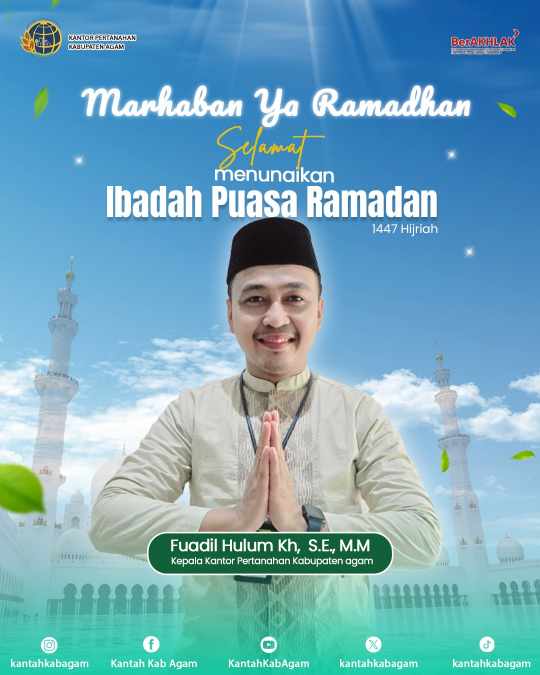 AGAM,(CYBER24.CO.ID) – Menyongsong datangnya bulan suci Ramadhan 1447 Hijriah, Kepala Kantor Pertanahan (Kantah) Kabupaten Agam, Fuadil Hulum Kh, S.E., M.M., menyampaikan pesan penuh makna bagi masyarakat dan jajaran internalnya. Selain memberikan ucapan selamat menjalankan ibadah puasa, beliau menekankan pentingnya menjaga etos kerja di tengah suasana religi.