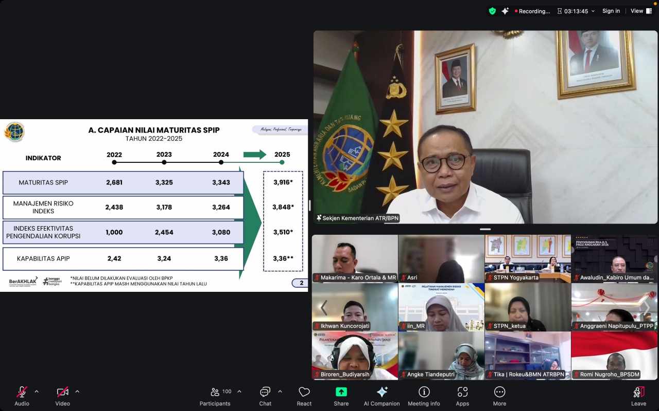 Adapun hasil penilaian mandiri yang dilakukan oleh Inspektorat Jenderal Kementerian ATR/BPN tahun 2025, meliputi empat indikator, yakni Maturitas SPIP 3,916; Manajemen Risiko Indeks 3,848; Indeks Efektivitas Pengendalian Korupsi 3,080; dan Kapabilitas APIP 3,36. Hasil ini selanjutnya akan dinilai oleh pihak eksternal, yakni Badan Pengawasan Keuangan dan Pembangunan (BPKP).