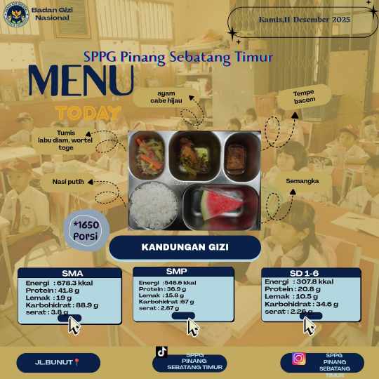 Kepala SPPG Siak Tualang Pinang Sebatang Timur, Fadila Afriansyah, menyatakan bahwa penyaluran hari ini berjalan lancar dengan menu yang terdiri dari nasi, ayam cabe hijau, tempe bacem, sayur wortel labu siam, serta buah semangka sebagai sumber vitamin.